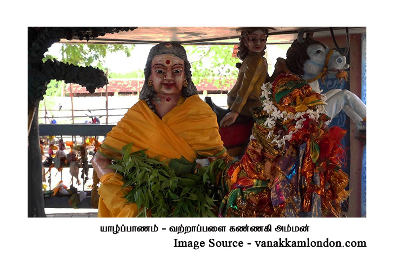 தமிழகத்தில் கண்ணகி பாண்டிய மன்னனை வீழ்த்திய புரட்சிப் பெண்ணாகவும், கற்புக்கரசியாகவும் கருதப்படுகிறாள். ஆனால் ஈழத்தில் அவள் மழையாற்றல் பெற்றவளாகவும், நோய் நொடிகள் தீர்ப்பவளாகவும், வாழ்வில் வளம் தருபவளாகவும், காவல் தெய்வமாகவும், பயிர்கள் கால்நடைகளைப் பாதுகாப்பவளாகவும் வணங்கப்படுகிறாள். இந்த முக்கிய வேறுபாடு ஈழத்தில் அவளின் இருத்தலைக் காட்டுகிறது.