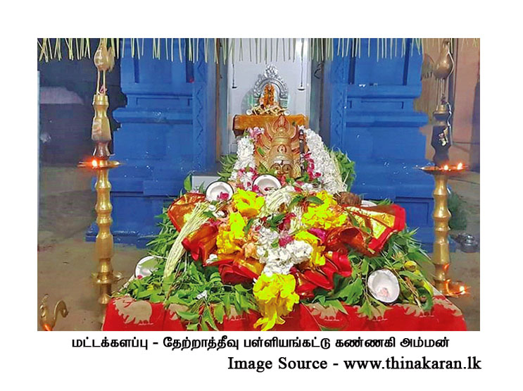 தமிழகத்தில் தசரா விழா நடைபெறும் குலசேகரப்பட்டினம் முத்தாலம்மன் கோயில் வழிபாட்டில் கண்ணகி கதை இடம்பெற்றிருப்பது இந்தத் தொல் எச்சங்களில் ஒன்றாகும். இவ்வாறான பல சான்றுகளை ஆராய்வாளர்கள் சுட்டிக் காட்டுகின்றனர் (பெருமாள், அ.கா. 2022). காலம் நிகழ்த்திய மாற்றத்தில் கண்ணகி வைதீகத்தின் தாக்கத்தாலும், இந்து மயமாக்கலாலும் தமிழ்நாட்டில் தன் உண்மையான அடையாளத்தை இழந்துவிட்டாள். ஆனால் ஈழத்தில் அவள் உயிர்ப்புடன் அருளாட்சி செய்கிறாள். ஆகவே தமிழ் மரபில் ஈழம் தனித்துவமாக நிற்கிறது.