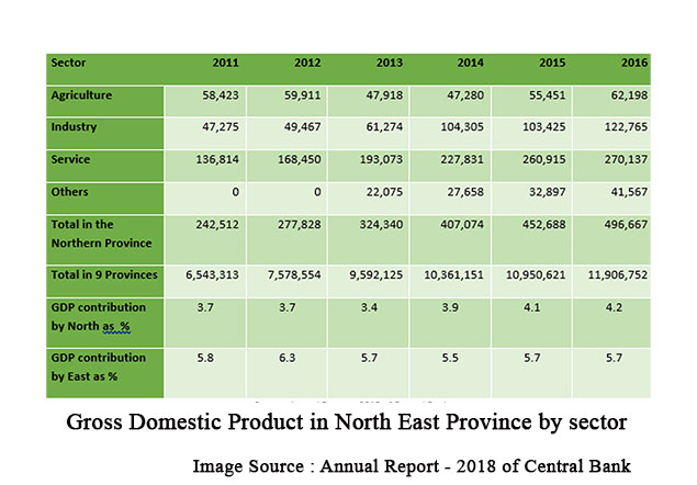 தேசிய திட்டமிடல் துறையால் தயாரிக்கப்பட்ட 1981-1990 காலகட்டத்திற்கான (1975 ஆம் ஆண்டு மாறாத விலையில்) மாகாண மொத்த உள்நாட்டு உற்பத்தியின் (Provincial GDP) தற்காலிக மதிப்பீட்டின்படி, அக்காலகட்டத்தின் தொடக்கத்தில் தேசிய மொத்த உள்நாட்டு உற்பத்திக்கான (National GDP) இம்மாகாணங்களின் பங்களிப்பு சுமார் 15% ஆக இருந்தது. பின்னர், இந்தப் பகுதியில் ஏற்பட்ட போர் நிலைமையின் விளைவாக, 1980களின் பிற்பகுதியில் இந்தப் பங்களிப்பு 10% இற்கும் கீழாகக் குறைந்தது.