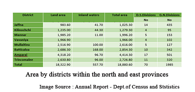 வடக்கு – கிழக்கு மாகாணங்கள், எட்டு மாவட்டங்களை உள்ளடக்கியவை. இதன் மொத்தப் பரப்பளவு 18,881 சதுர கிலோமீட்டர்கள் ஆகும். இதில், சுமார் 558 சதுர கிலோமீட்டர் பரப்பு நீர்நிலைகளால் (உள்நாட்டு ஏரிகள், நீர்த்தேக்கங்கள்) ஆக்கிரமிக்கப்பட்டுள்ளது. நாட்டின் மொத்தப் பரப்பளவில் இம்மாகாணங்கள் 28.77% பகுதியைக் கொண்டுள்ளன. ஒவ்வொரு மாவட்டத்தின் விவரமான பரப்பளவு, அட்டவணை 3.2 இல் காண்பிக்கப்பட்டுள்ளது.
