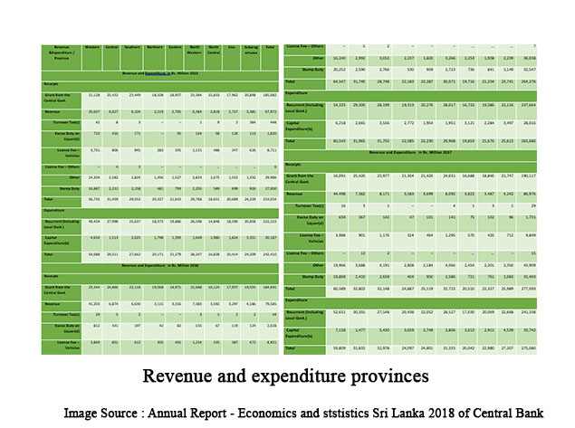 மாகாண சபைகள், உள்ளூர் வரிகள் மற்றும் சுங்கத் தீர்வைகள் மூலம் தங்கள் சொந்த வருவாயை ஈட்டுவதாக எதிர்பார்க்கப்படுகின்றன. எனினும், பிரச்சினைக் காலம் முழுவதும் சட்டபூர்வமான தேவைகள் சரிவரச் செயற்படுத்தப்படாத காரணத்தால், வடக்கு – கிழக்கு மாகாணங்கள் குறைந்த அளவிலேயே வருவாயை ஈட்ட முடிந்தது. 2015 ஆம் ஆண்டு மாகாணங்களுக்கிடையேயான வருவாய் மற்றும் செலவின ஒப்பீடு அட்டவணை 3.3 இல் கொடுக்கப்பட்டுள்ளது.