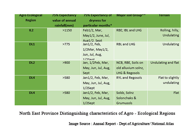 வடக்கு – கிழக்கு மாகாணங்கள் பெரும்பாலும் வறண்ட மண்டலத்திற்குள் வருகின்றன. இம்மாகாணங்களின் முக்கிய விவசாயச் சூழல் (Agro – Ecological) பிரதேசங்கள் DL1, DL2, DL3, DL4, DL5 என வரையறுக்கப்பட்டுள்ளன; மிகச் சிறிய அளவில் IL2 பிரிவும் காணப்படுகிறது.