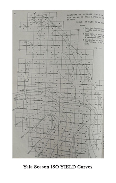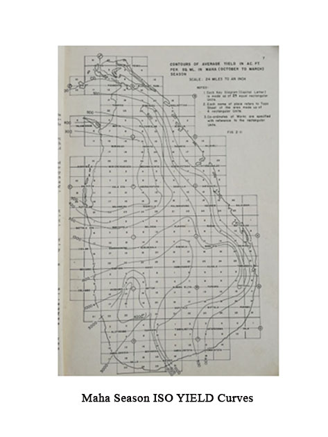 நீர்ப்பிடிப்புப் பகுதிகளில் (Catchments) நீரின் மகசூல், மஹா இலுப்பல்லம வேளாண்மை ஆராய்ச்சி மேம்பாட்டு மையம் மற்றும் நீர்ப்பாசனத் துறையால் தயாரிக்கப்பட்ட சம மகசூல் வரைபடங்கள் (ISO – Yield Curves) மூலம் கணக்கிடப்படுகிறது. மஹா பருவத்திற்கான மற்றும் யாலா பருவத்திற்கான சம மகசூல் வரைபடங்கள் முறையே படம் 3.2 மற்றும் படம் 3.3 இல் கொடுக்கப்பட்டுள்ளன.
