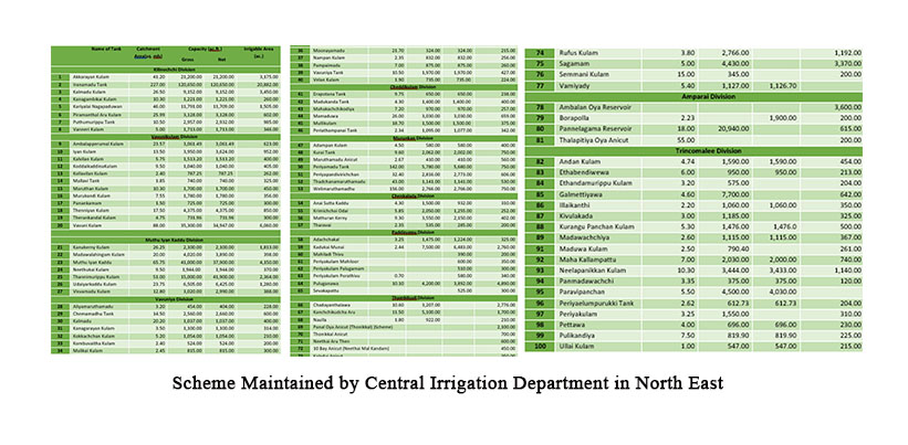 வடக்கு – கிழக்கு மாகாணங்களில் ‘அசுவெத்துமை’ செய்யப்பட்ட (Asweddumized) மொத்த நிலப்பரப்பு 261,000 ஹெக்டயர் ஆகும். இது நாட்டின் மொத்த ‘அசுவெத்துமை’ செய்யப்பட்ட பரப்பில் தோராயமாக 34% ஆகும். இதில், 150,000 ஹெக்டயர் மட்டுமே முக்கிய மற்றும் சிறு நீர்ப்பாசனத் திட்டங்களால் பயன்படுத்தப்படுகிறது. இந்த நீர்ப்பாசனப் பகுதியின் பெரும்பாலானவை மஹா பருவத்தில் சாகுபடி செய்யப்படுகிறது. யால பருவத்தில் நீர்த்தேக்கங்களில் போதிய நீர் சேமிப்பின்மை மற்றும் குறைந்த மழையளவு ஆகிய காரணங்களால், யாலா சாகுபடிப் பரப்பு சுமார் 25%-50% மட்டுமே உள்ளது.