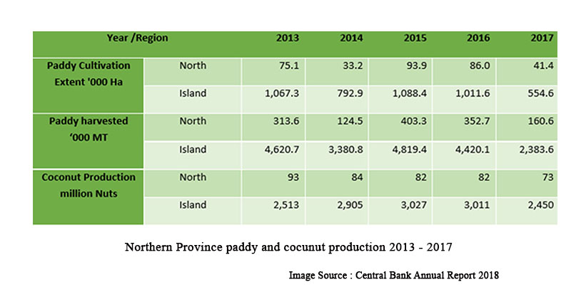 இந்த எண்ணிக்கைகள், 1980களின் நடுப்பகுதியில் இருந்து உற்பத்தியில் பாதகமான தாக்கத்தை ஏற்படுத்தியிருந்தாலும், இம்மாகாணங்கள் நாட்டின் மொத்த நெல் உற்பத்தியில் தோராயமாக கால் பங்கை ஈடுசெய்து வந்துள்ளன என்பதை வெளிப்படுத்துகின்றன. போர் முடிந்த பின்னர், வட மாகாணத்தில் நெல் மற்றும் தேங்காய் உற்பத்தியின் சிறந்த தரவை அட்டவணை 3.7 வழங்குகிறது.