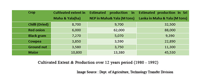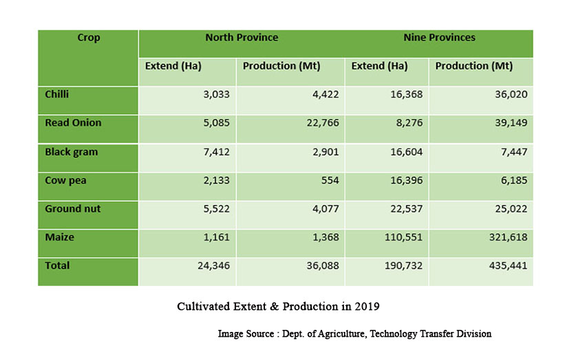 இந்த மாகாணங்கள் பாரம்பரியமாக மிளகாய் மற்றும் வெங்காயத்தின் முக்கிய உற்பத்தியாளர்களாக விளங்குகின்றன. பிரச்சினை தொடங்குவதற்கு முன்னர், நாட்டின் மொத்த உலர்ந்த மிளகாய் உற்பத்தியில் 40%, மொத்த சிவப்பு வெங்காய உற்பத்தியில் 85% மற்றும் தானிய பருப்பு வகைகளில் 30% வடக்கு – கிழக்கு மாகாணங்களில் இருந்து வந்தன. யாழ்ப்பாணம், கிளிநொச்சி மற்றும் வவுனியா ஆகிய பகுதிகளில் மிளகாய் மற்றும் வெங்காயம் நீர்ப்பாசனத்தின் கீழ் தீவிரமுறையில் சாகுபடி செய்யப்படுகின்றன. மாகாணத்தின் பிற பகுதிகளில், மஹா பருவத்தில், மழைநீரை நம்பியவாறு குறைந்த அளவில் இவை சாகுபடி செய்யப்படுகின்றன.