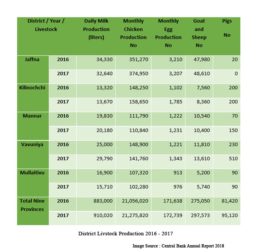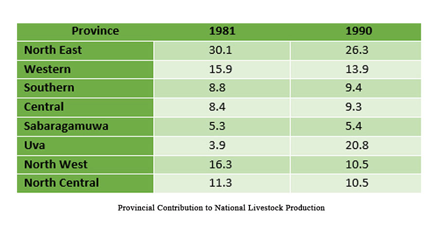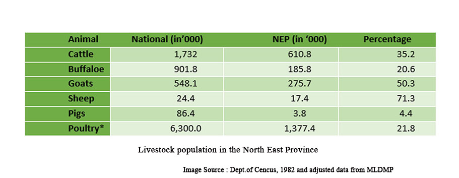 நாட்டின் மொத்த மாடுகளின் தொகையில் மூன்றில் ஒரு பங்கிற்கும் மேலும், வெள்ளாடுகளின் தொகையில் சுமார் 50% பங்கும் வடக்கு – கிழக்கு மாகாணங்களில் காணப்படுகின்றன. பிரச்சினைக்கு முந்தைய காலத்தில், 1982 ஆம் ஆண்டில் வடக்கு – கிழக்கு மாகாணங்களில் இருந்த கால்நடைகளின் தொகை, கணக்கெடுப்புத்துறையின் அறிக்கையின்படி, அட்டவணை 3.11 இல் காண்பிக்கப்பட்டுள்ளது. பிரச்சினைக்கு முந்தைய காலத்தில், கால்நடை உற்பத்தியில் வடக்கு – கிழக்கு மாகாணங்கள் ஒரு முக்கியமான இடத்தைப் பிடித்திருந்தன; மேலும் நாட்டின் மொத்த உற்பத்தியில் 25% இற்கும் மேல் பங்களித்து வந்தன. போருக்குப் பிந்தைய மற்றும் போருக்கு முந்தைய கால்நடை நிலைமைகளின் ஒப்பீடு, எளிதான குறிப்பிற்காக, அட்டவணை 3.10 மற்றும் 3.12 இல் கொடுக்கப்பட்டுள்ளது.