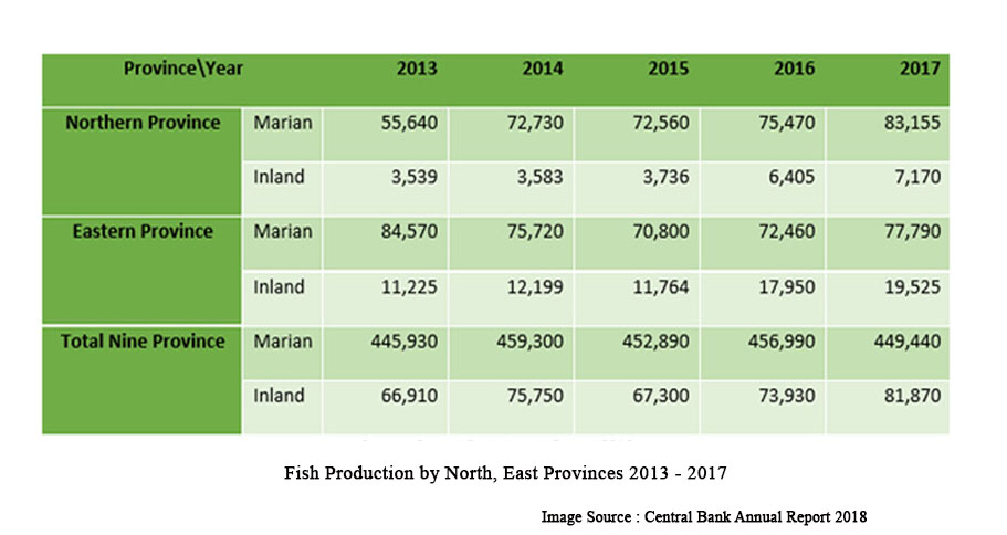இலங்கையின் கடலோரப் பகுதியில் 63% வடக்கு – கிழக்கு மாகாணங்களில் அமைந்துள்ளது. மேலும் 24,000 ஹெக்டயருக்கும் அதிகமான உவர்நீர்ச் (Brackish Water) சதுப்பு நிலங்களும் இங்கு உள்ளன. கூடுதலாக, நன்னீர் மீன்வள மேம்பாட்டிற்கு ஏற்ற 93 நன்னீர் நீர்த்தேக்கங்கள் உள்ளன. கண்டத்திட்டு (Continental Shelf) சுமார் 40 கி.மீ. வரை நீண்டுள்ளது. வட மாகாணத்தின் வடபகுதியில், பிரபலமான ‘பீட்ரோ மீன் வங்கி’ (Pedro Fish Bank) அமைந்துள்ளது. வடக்கு – கிழக்கு மாகாணங்கள் பாரம்பரியமாக மீனின் முக்கிய ஆதாரமாக விளங்குகின்றன. மீன்வள அமைச்சகத்தின் 1983 ஆம் ஆண்டு வருடாந்திர அறிக்கையின்படி, 1983 ஆம் ஆண்டில் உற்பத்தி 104,400 மெட்ரிக் டன் (M tons) ஆக இருந்தது. இது அந்த ஆண்டு நாட்டின் மொத்த மீன்பிடிப்பில் 56.6% ஆகும். பிடிபட்ட மீன்களில் சுமார் 60% பிற நகரங்களுக்கு கொண்டு செல்லப்பட்டு விற்கப்படுகிறது. மாகாணங்களுக்கிடையேயான மீன் உற்பத்தியின் ஒப்பீடு அட்டவணை 3.13 இல் கொடுக்கப்பட்டுள்ளது. மீன்கள் தவிர, இறால், சுறா துடுப்பு (Shark Fin) மற்றும் கடலட்டை (Beche-De-Mer) போன்ற ஏற்றுமதிப் பொருட்களில் 50% இற்கும் மேல் வடக்கு – கிழக்கு மாகாணங்களில் இருந்து வருகின்றன. இந்த நிலைமை, இனப் பிரச்சினையின் காரணமாக மாற்றமடைந்துள்ளது. 60,000 இற்கும் மேற்பட்ட குடும்பங்களுக்கு மீன்பிடித்தல் முக்கிய வாழ்வாதாரமாக இருந்து வருகிறது.