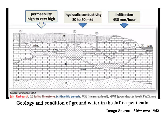 யாழ்ப்பாண நிலத்தின் ‘போரோசிட்டி’ (Porosity) 4.5% முதல் 27% வரை மாறுபடுகிறது; சராசரி 15% ஆக இருக்கின்றது. இதனால் நிலத்தடி நீருக்கும், கடலுக்கும் தொடர்பு ஏற்பட்டுவிட்டது. கடல்நீர் அடர்த்தி அதிகமாக இருப்பதால் மேற்பரப்பில் இருந்து உள்ளே செல்லும் மழைநீர் கடல்நீர் மேல் வில்லை போன்று தேங்கி நிற்கிறது. இச்செயற்பாட்டை கீழே உள்ள படம் விவரிக்கின்றது.