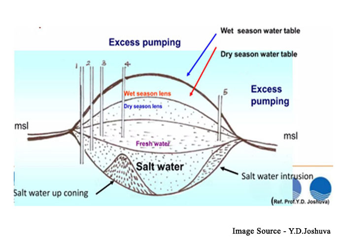 நாம் மோட்டர்களால் நீரை அதிவேகமாக உறிஞ்சி எடுக்கும் போது கடல் நீர் உள்ளே வந்து நிலத்தடி நீரை உப்பாக்குகிறது. பழைய காலங்களில் நாம் உறிஞ்சி எடுக்கும் நீரின் வேகம் குறைவாகவும், எடுக்கப்படும் நீரின் அளவு, இப்போதுள்ளதுடன் ஒப்பிடுகையில் குறைவாகவும் இருந்தது. உறிஞ்சி வெளியே எடுக்கப்படும் நீருக்குச் சமனான கடல்நீர் நிலத்தடி நீருக்குள் உட்புகுந்து நன்னீருடன் கலப்பதால் உப்புத்தன்மை அதிகரிக்கிறது. இச்செயற்பாட்டையும் மேலே உள்ள படம் விவரிக்கின்றது. வருடக் கடைசியில் பெறும் மழைநீரை நாம் நீண்டகாலம் சேமித்து வைத்திருக்க முடியாமலும் போகின்றது. வருடத்திற்கு 1200 – 1300 மி.மீ என்ற மழை வீழ்ச்சியை நாம் பெற்றாலும், எங்களால் மழைநீரை நிலத்தின் கீழ் சேமித்து வைக்க முடியதவாறு, எமது நில அமைப்பு அமைந்து இருப்பது எமது துர்ப்பாக்கியமே.