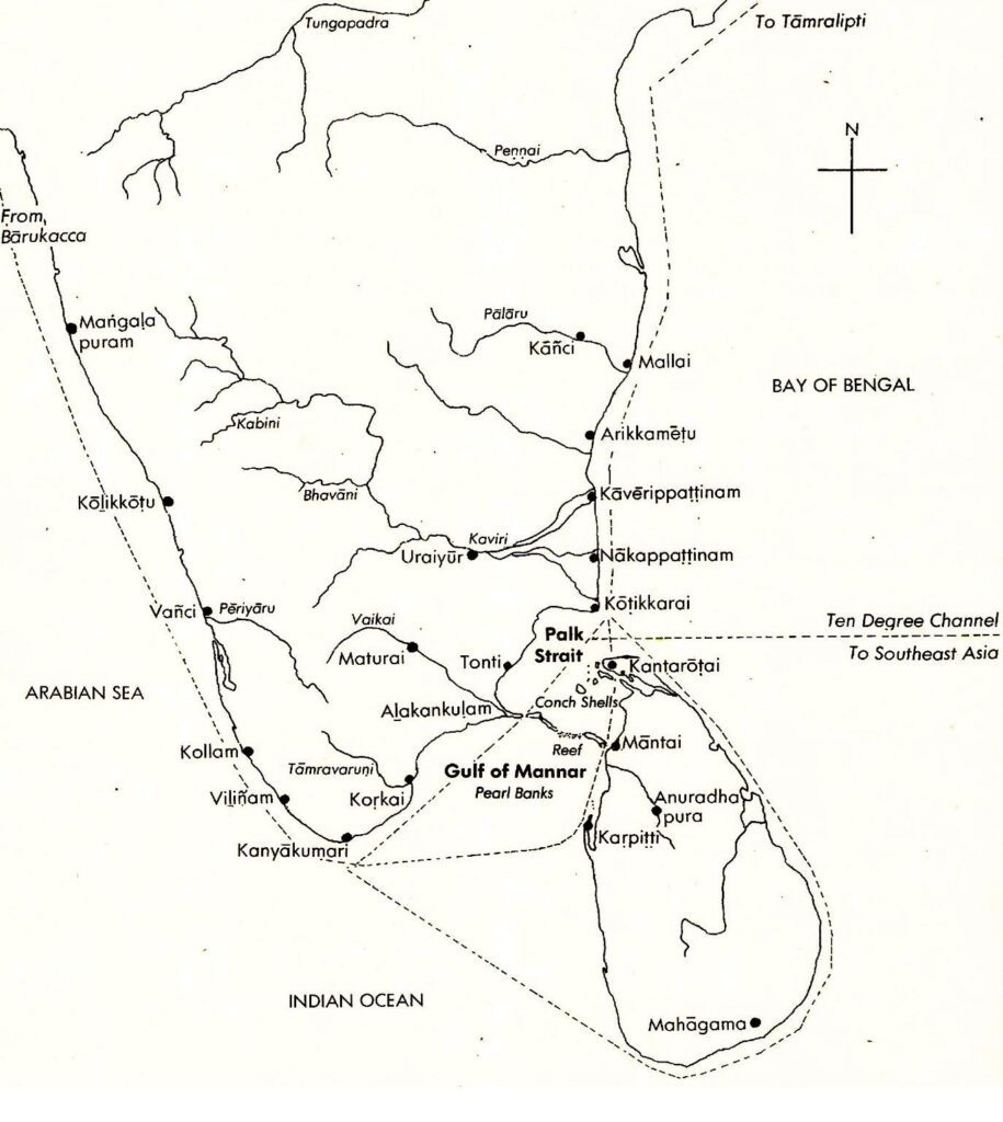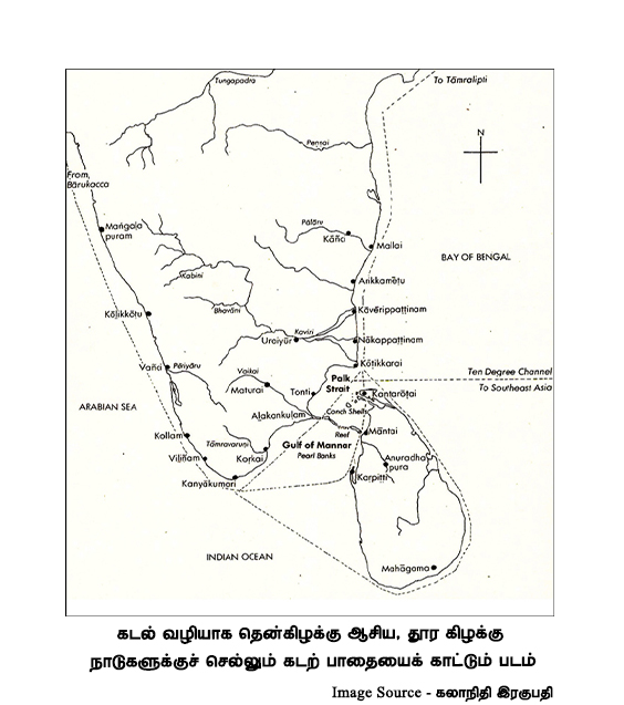 இந்திய – இலங்கைக் கரையோரமாகவும், மன்னார்க் குடா வழியாகவும், பாக்கு நீரிணையை அடைந்து பின் பத்தாம் பாகைக் கடல் வழியாக தென்கிழக்கு ஆசிய, தூர கிழக்கு நாடுகளுக்குச் செல்லும் கடற்பாதையைக் காட்டும் படம். நன்றி: கலாநிதி இரகுபதி.