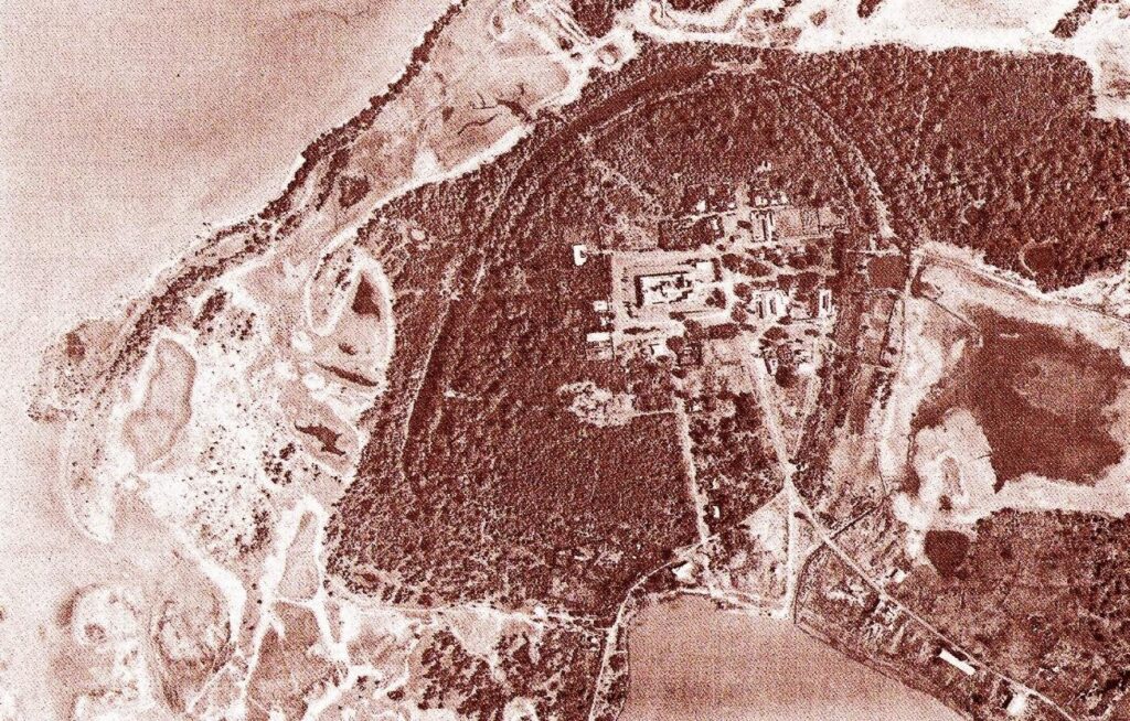 மாந்தைத் துறைமுக நகரத்தைச் சுற்றிவர உள்ள இரட்டை மதில் சுவரைக் காட்டும் வான்வெளிப் படம். அடியில் வலது பக்கத்தில் பாலாவி ஏரி காணப்படுகிறது. Image Source: 1980 Aerial Photograph.