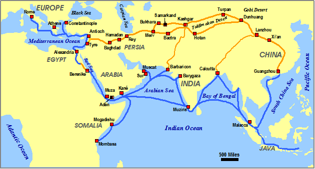 பண்டைக்காலக் கடற்பாதை. கிழக்கே சீனாவில் குவாங்சு துறையில் ஆரம்பித்து, தென்சீனக் கடல்வழியாக தென் ஆசியத் துறைகளைத் தொட்டு, வங்காள விரிகுடா வழியாக வட இலங்கையின் துறைகளை அடைந்து, மேற்கு இந்தியக் கரையில் முசிறியை அடைந்து, பின் அரேபியக் கடல் வழியாக மேற்கு ஆசிய, அரேபிய நாடுகளுக்கும், செங்கடல் வழியாக மத்திய தரைக்கடல் நாடுகளையும் உரோமபுரியையும் சென்றடைகிறது. மற்றொரு கிளைப்பாதை இந்துமாகடல் வழியாக மேற்கு ஆபிரிக்க நாடுகளைச் சென்றடைகிறது. மேலே சிவப்பு நிறத்தில் காட்டப்படுவது தரை மார்க்கமான பட்டுப்பாதை.