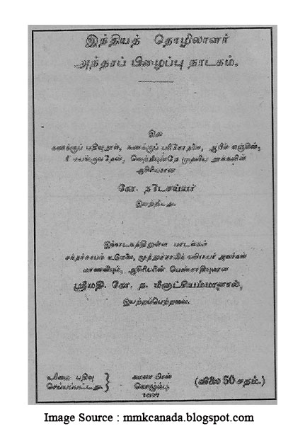 ‘தொழிலாளர்களின் அந்திரப் பிழைப்பு’ நாடக நூலில் உள்வாங்கப்பட்டுள்ள பாடல்கள் இந்நூல் வெளிவருவதற்கு ஆறு வருடங்களுக்கு முன்னரே இரண்டு பாகங்களாக வெளிவந்துள்ளமை அவதானத்திற்குரியதாகும். 1937 ஆம் வருடமே இந்நாடக நூல் வெளிவந்துள்ள நிலையில், 1931 ஆம் வருடமே பாடல்களின் முதல் இரண்டு பாகங்களும் வெளியிடப்பட்டுள்ளன. பாடல்களின் மூன்றாவது தொகுப்பு நாடகத் தொகுப்புடன் இணைந்த நிலையிலேயே வெளிவந்துள்ளது. நாடகமும் மூன்று அங்கங்களைக் கொண்டுள்ள நிலையில் அவ்வவ் அங்கங்களுக்கு ஏற்ற வகையிலேயே பாடல்களின் தொகுப்புகளும் பாகங்களாகப் பிரிக்கப்பட்டுள்ளமை குறிப்பிடத்தக்கதாகும். முதல் இரண்டு பாகங்களும் 06.12.1931 திகதியிடப்பட்டே வெளியிடப்பட்டுள்ளன. முதலாம் பாகத்திற்கான ஆசிரியரின் முன்னுரை வரிகள் பின்வருமாறு அமைகின்றது. “இலங்கைத் தோட்டங்களில் வேலை செய்யும் 8 லட்சம் இந்தியத் தொழிலாளர் நிலைமைப் பற்றி சாதாரண சனங்கள் அறிய வேண்டியது மிக்க அவசியமாகி விட்டது. இத்தகைய பிரசாரத்திற்கு நாடகங்களே தக்க சாதனங்களாகும். அந்நோக்கம் பற்றியே தோட்டத் தொழிலாளர் நாடகம் ஒன்று எழுதப்பெற்று வருகிறது. அந்நாடகத்தில் சேர்க்கப்பெற்றுள்ள சில பாடல்களைச் சேர்த்து, ஓர் சிறு புஸ்தகமாய் இப்புஸ்தகம் பிரசுரிக்கப் பெற்றிருக்கிறது.” இவ்வரிகள் ஊடாக, நாடகத்திற்கு முன்னரே இயற்றப்பட்ட பாடல்களுக்கு அமையவே நாடகம் உருப்பெற்றிருப்பதற்கான வாய்ப்பு நிலவுவதை அவதானிக்க முடிகிறது.