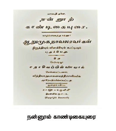 - ஆறுமுக நாவலர், 1891, நன்னூற் காண்டிகையுரை, வித்தியாநுபாலன யந்திரசாலை, சென்னை.