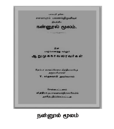 - ஆறுமுக நாவலர் பதிப்பு, 1957, நன்னூல் மூலம், வித்தியாநுபாலன யந்திரசாலை, சென்னை.