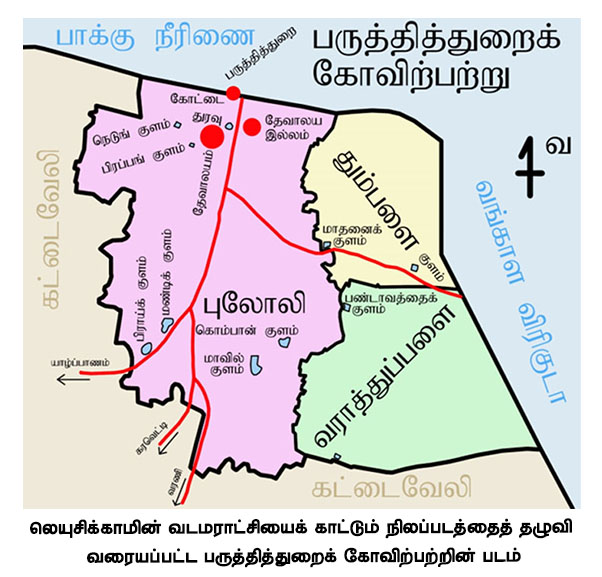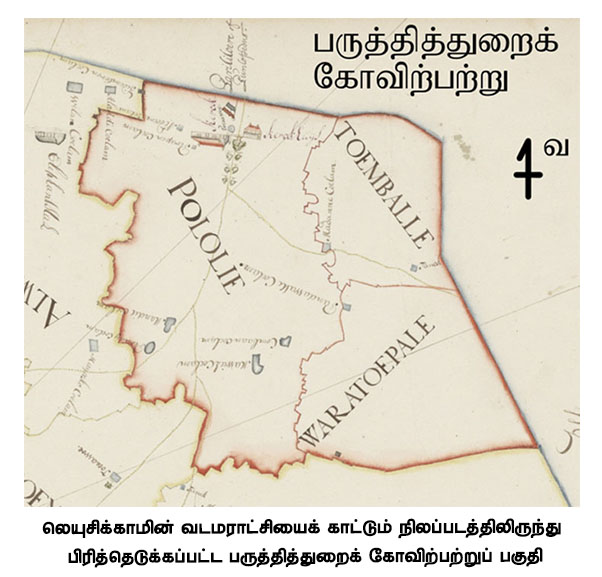 லெயுசிக்காமின் வலிகாமப் பிரிவைக் காட்டும் நிலப்படத்தில் அச்சுவேலிக் கோவிற்பற்றுத் தொடர்பாகக் காணப்படும் தகவல்களையும், அவற்றோடு தொடர்புடைய வரலாற்றுக் குறிப்புகளையும் சென்ற கட்டுரையில் பார்த்தோம். அத்துடன், வலிகாமத்திலுள்ள 14 கோவிற்பற்றுகளைப் பற்றிய விவரங்களும் சென்ற கட்டுரையுடன் நிறைவடைந்தன. இந்தக் கட்டுரையில், வடமராட்சிப் பிரிவிலுள்ள கோவிற்பற்றுகளைப் பற்றிய விவரங்கள் தொடங்குகின்றன. வடமராட்சிப் பிரிவில் பருத்தித்துறை, கட்டுவேலி (கட்டைவேலி), உடுப்பிட்டி ஆகிய மூன்று கோவிற்பற்றுகள் உள்ளன. முதலில் பருத்தித்துறைக் கோவிற்பற்றுத் தொடர்பாக நிலப்படத்திலுள்ள விவரங்களை ஆராயலாம்.