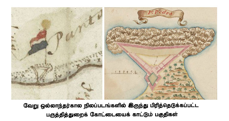 ஒல்லாந்தர் கால நிலப்படங்களில் கோட்டையைக் குறிப்பதற்குக் கோட்டையின் சிறிய தள வடிவத்தைக் காட்டும் ஒரு குறியீட்டை, ஒரு ஒல்லாந்தக் கிழக்கிந்தியக் கம்பனிக் கொடியை, அல்லது இரண்டையும் காட்டுவது வழக்கம். இந்த நிலப்படத்தில் பருத்தித்துறையில் கொடி மட்டுமே உள்ளது, கோட்டையின் குறியீடு இல்லை. ஆனாலும், இங்கே ஒரு கோட்டை இருந்தது பற்றி வேறு நிலப்படங்களிலும் எழுத்துமூல ஆவணங்களிலும் சான்றுகள் உள்ளன. எடுத்துக்காட்டாக, 1690 – 1743 காலப்பகுதியில் வரையப்பட்ட ‘யாழ்ப்பாணப் பட்டினமும் அதைச் சேர்ந்த நிலப்பகுதிகளும் தீவுகளும்’ எனத் தலைப்பிட்ட நிலப்படம் பருத்தித்துறையில் முக்கோண வடிவக் கோட்டையைக் காட்டுகிறது. 1751 ஆம் ஆண்டில் வரையப்பட்டதும், இலங்கையிலிருந்த எல்லாக் கோட்டைகளின் தளவடிவங்களையும் உட்செருகலாகக் காட்டுவதுமான இன்னொரு நிலப்படத்திலும் பருத்தித்துறைக் கோட்டையின் தளவடிவமும் அடங்கியுள்ளது (படம்-4). யாழ்ப்பாணக் கோட்டை உள்ளடங்கலாக வடபகுதியிலுள்ள நான்கு கோட்டைகளைக் காட்டும் நிலப்படம் ஒன்றிலும் பருத்தித்துறைக் கோட்டையின் தளப்படம் உள்ளது. எனவே, லெயுசிக்காமின் வடமராட்சியைக் காட்டும் நிலப்படத்தில் கொடி, அவ்விடத்திலிருந்த கோட்டையையே குறித்துக் காட்டுவதாகக் கொள்ளலாம்.
