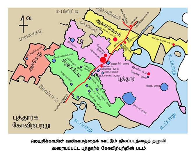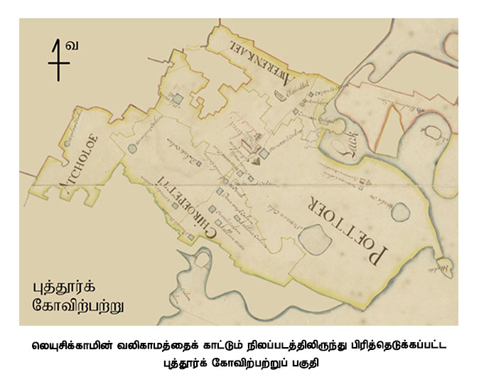 லெயுசிக்காமின் வலிகாமப் பிரிவைக் காட்டும் நிலப்படத்தில் அச்சுவேலிக் கோவிற்பற்றுத் தொடர்பாகக் காணப்படும் தகவல்களையும், அவற்றோடு தொடர்புடைய வரலாற்றுக் குறிப்புகளையும் சென்ற கட்டுரையில் பார்த்தோம். இந்தக் கட்டுரையில், புத்தூர்க் கோவிற்பற்றுத் தொடர்பாக நிலப்படத்திலுள்ள விவரங்களை ஆராயலாம்.