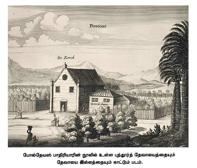 ஏற்கெனெவே, மேலே குறிப்பிட்ட யாழ்ப்பாணம் – பருத்தித்துறை வீதிக்கு அருகில் அதன் மேற்குப் பக்கத்தில் இவ்விரு கட்டடங்களும் இருப்பதை நிலப்படம் காட்டுகிறது. இவை புத்தூர்த் துணைப் பிரிவுக்குள் உள்ளன. போல்தேயஸ் பாதிரியாரின் நூலில் தேவாலயத்தினதும் தேவாலய இல்லத்தினதும் கட்டட அமைப்புகளைப் பற்றி எந்தத் தகவலும் இல்லை. அங்குள்ள மாணவர்களின் தொகையையும் போதனையைக் கேட்க வருபவர்களின் எண்ணிக்கையையும் மட்டுமே அவர் குறிப்பிட்டுள்ளார். அதுவும், வலிகாமப் பிரிவின் தேவாலயங்கள் பற்றிய விவரங்கள் அவ்வளவுதான் என முடித்த பின்னர் புத்தூரிலும் தேவாலயம் இருந்ததாகத் தகவல் தருகிறார்.1 இவ்வாறு புத்தூர்த் தேவாலயத்துக்கு முக்கியத்துவம் கொடுக்காமல் விட்டதற்கான காரணம் தெரியவில்லை. ஆனால், புத்தூர்த் தேவாலயத்தையும் தேவாலய இல்லத்தையும் காட்டும் படம் நூலில் உள்ளது.2 படத்தின்படி இவ்விரு கட்டடங்களும் நிரந்தரமான கட்டடப் பொருட்களால் ஆனவையாகவே தோன்றுகின்றன (படம்-3). நூலில் இக்கட்டடங்கள் தொடர்பான எழுத்துமூலத் தகவல்கள் இல்லாததால், படத்தின் நம்பகத் தன்மை கேள்விக்குரியதே. எனவே இப்படத்தை வைத்துத் தேவாலயத்தின் அமைப்புத் தொடர்பான எந்த முடிவுக்கும் வரமுடியாது.